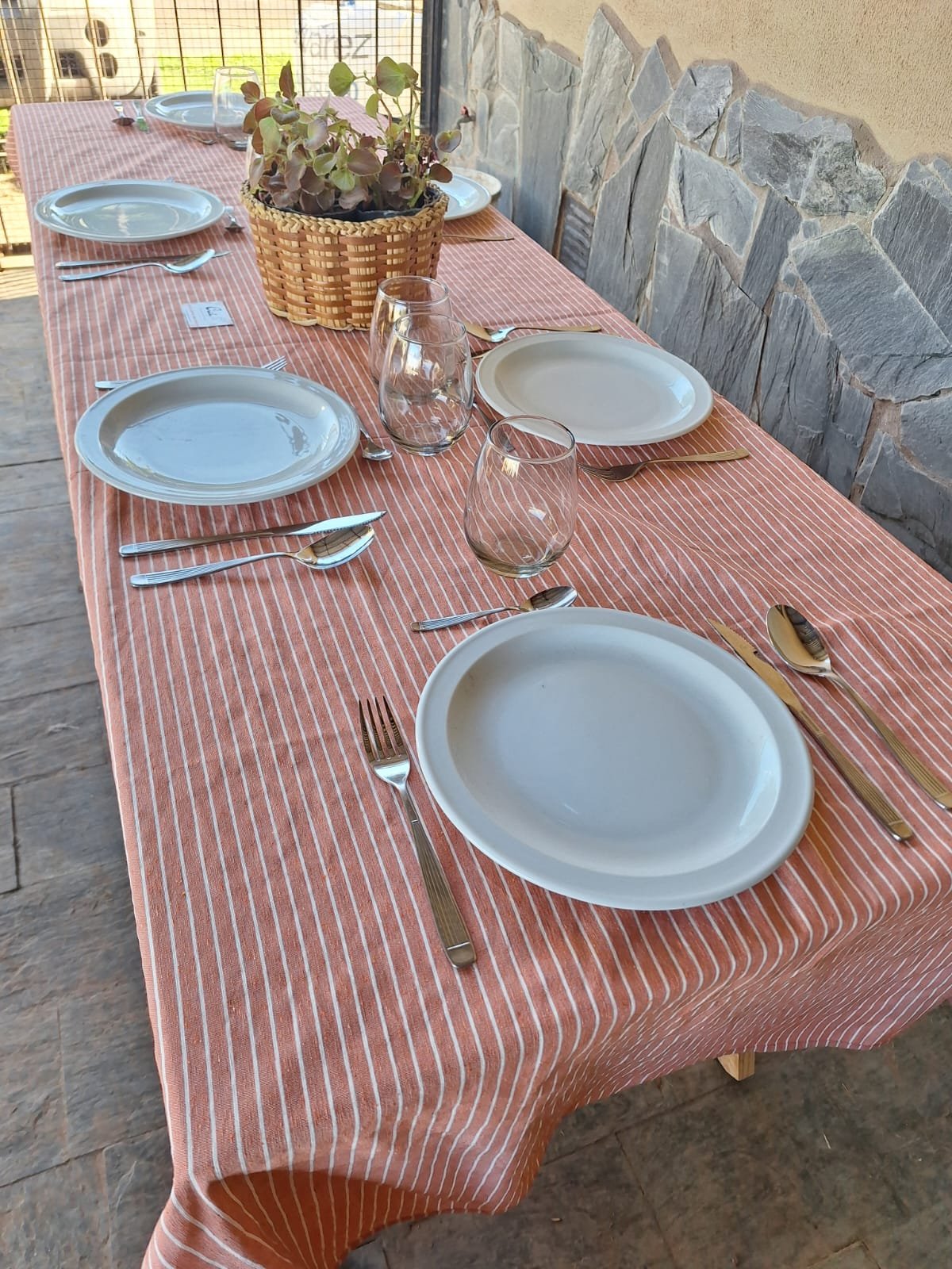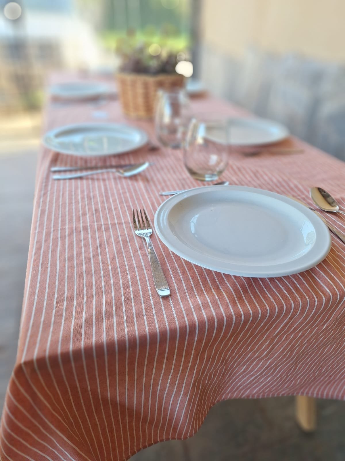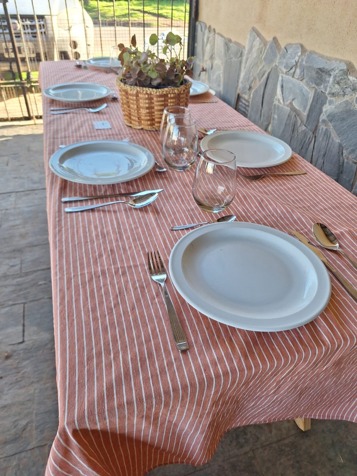 El mantel Belice destaca por su diseño simple y elegante, ideal para dar un toque cálido y acogedor a la mesa. Presenta un fondo en tono marrón, naranja, violeta y rojo decorado con finas líneas blancas dispuestas en un patrón de rayas paralelas que aportan dinamismo y modernidad sin perder la sobriedad.